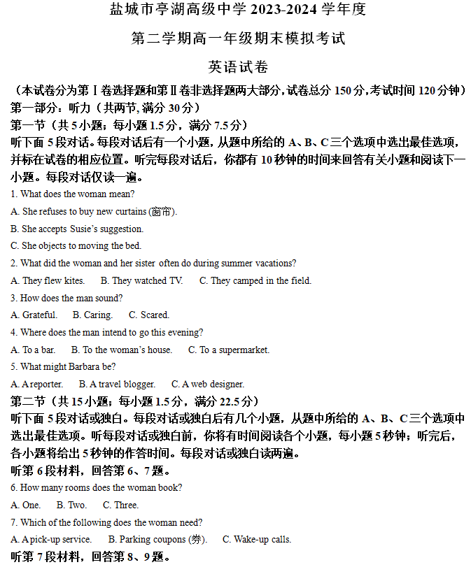 江苏100教学资源网 高一下 江苏省盐城市亭湖高级中学2023-2024学年高一下学期期末模拟英语试题(含解析) https://www.jiangsu100.com/10311.html