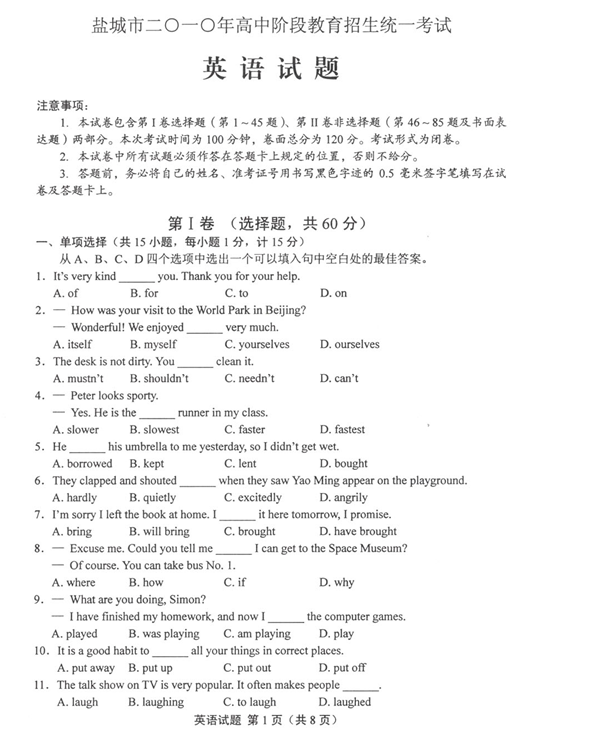江苏100教学资源网 英语 2010年江苏省盐城市中考英语试题(含答案) https://www.jiangsu100.com/11805.html