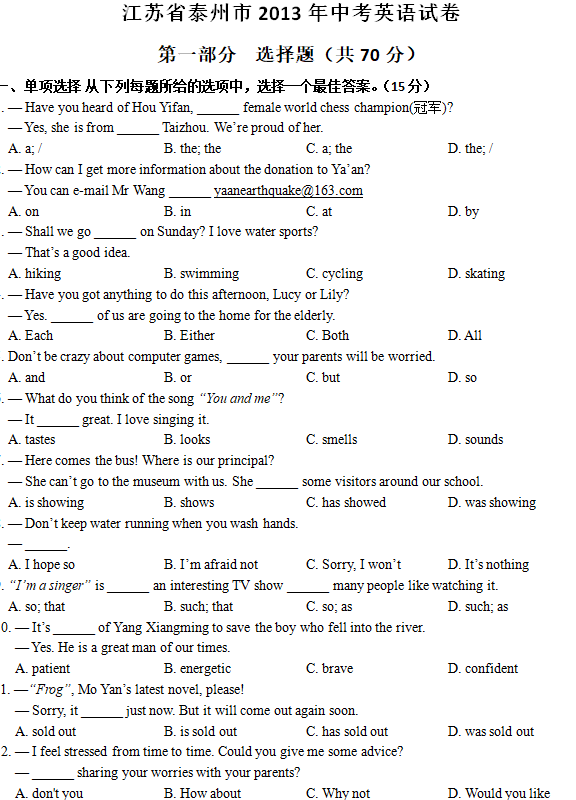 江苏100教学资源网 英语 2013年江苏省泰州市中考英语试卷(含答案) https://www.jiangsu100.com/11915.html