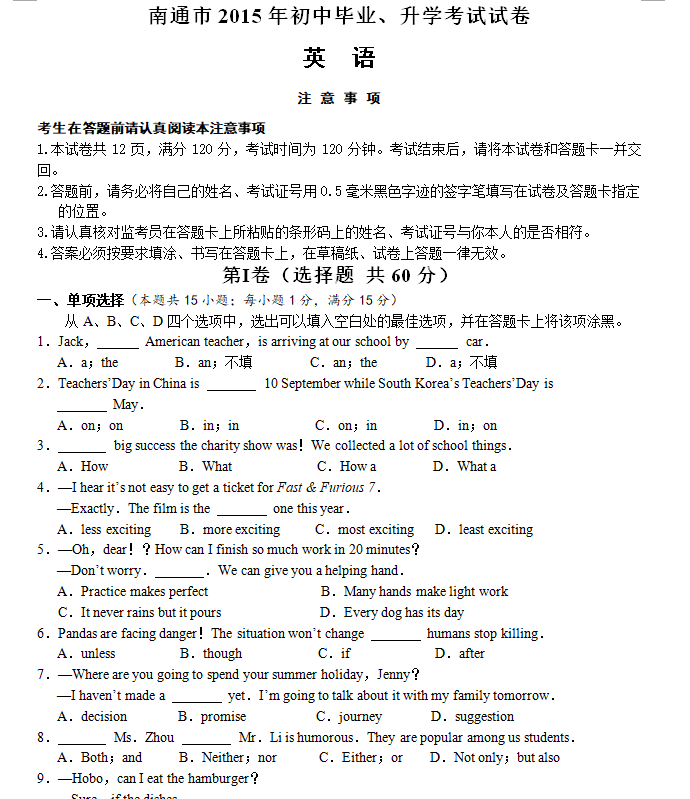 江苏100教学资源网 英语 2015年江苏省南通市中考英语试题(含答案) https://www.jiangsu100.com/11984.html