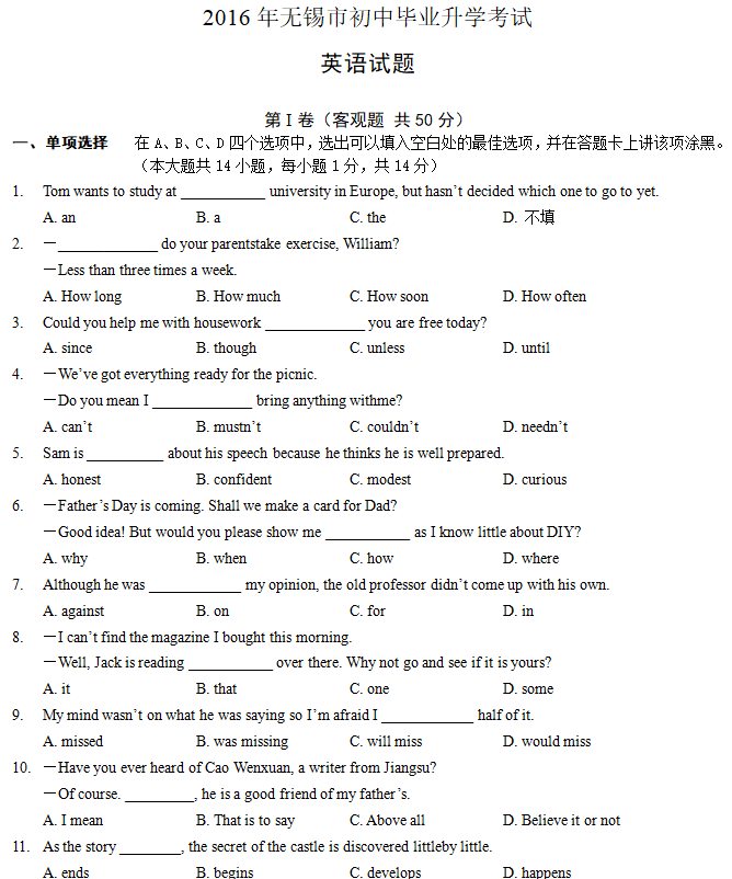 江苏100教学资源网 英语 2016年江苏省无锡市中考英语试卷(含答案) https://www.jiangsu100.com/12035.html