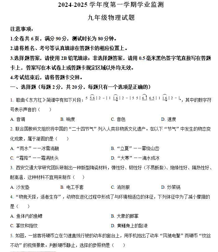 江苏省淮安市2024-2025学年九年级上学期期中学业监测物理试题(含解析)