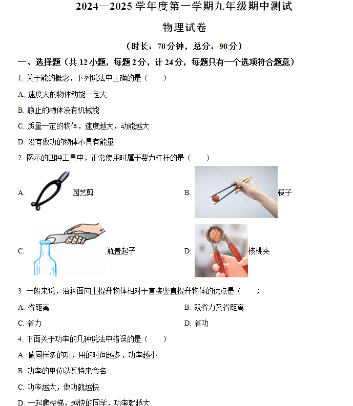 - 江苏省镇江市京口区京口中学、镇江市第十中学2024-2025学年九年级上学期11月期中物理试题(含答案) 2025-09-19