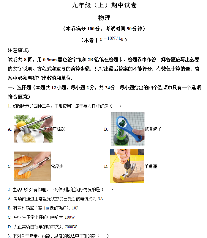 江苏100教学资源网 九上 江苏省南京市鼓楼区2024-2025学年九年级上学期期中考试物理试题(含解析) https://www.jiangsu100.com/13944.html