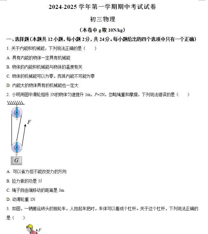 - 江苏省扬州市朱自清中学等2024-2025学年九年级上学期11月期中物理试题(含解析) 2025-09-19