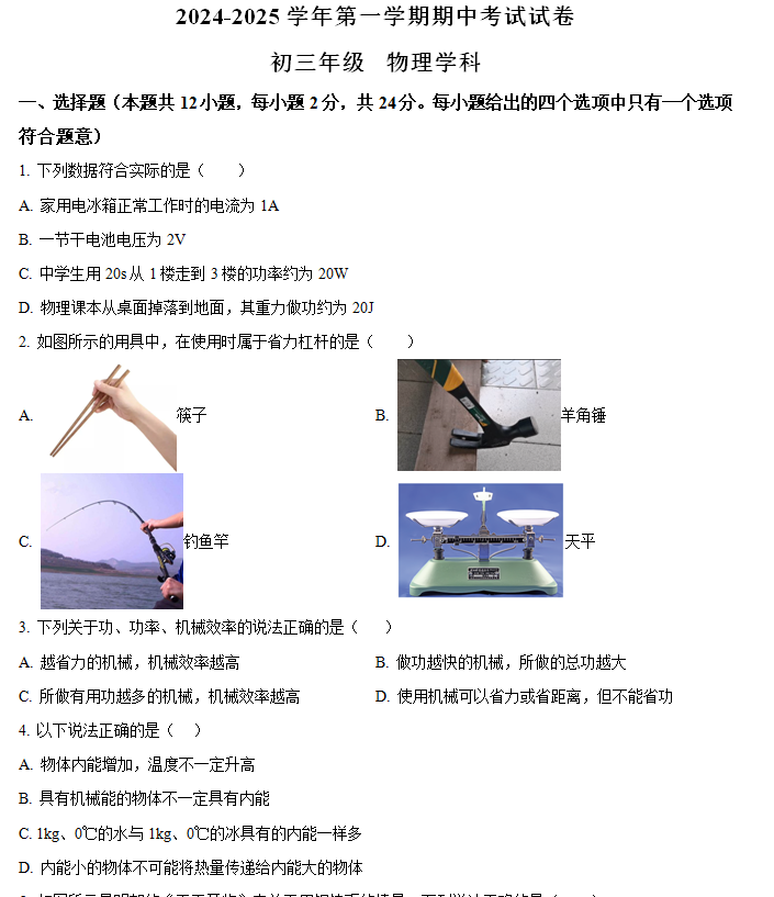 江苏100教学资源网 九上 江苏省苏州市工业园区五校联考2024-2025学年九年级上学期11月期中物理试题(含解析) https://www.jiangsu100.com/13969.html
