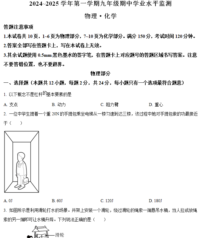江苏100教学资源网 九上 江苏省宿迁市泗阳县2024-2025学年九年级上学期期中考试物理试题(含解析) https://www.jiangsu100.com/13988.html
