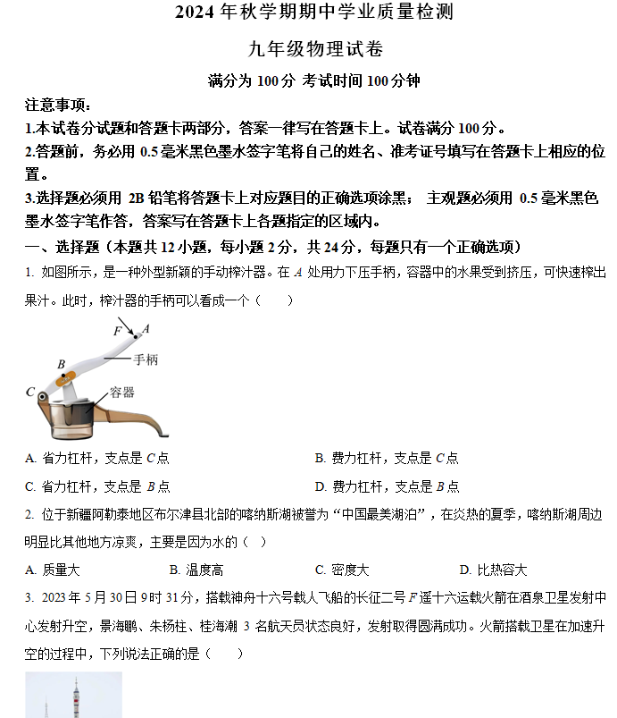 江苏100教学资源网 九上 江苏省无锡市滨湖区无锡市梅里中学2024-2025学年九年级上学期11月期中物理试题(含解析) https://www.jiangsu100.com/14003.html