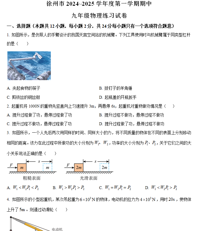 江苏100教学资源网 九上 江苏省徐州市柳新镇中心中学2024-2025学年九年级上学期期中调研物理试题(含解析) https://www.jiangsu100.com/14031.html