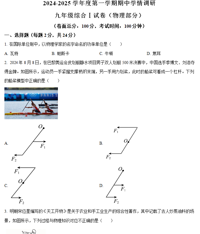 江苏100教学资源网 九上 江苏省盐城市大丰区2024-2025学年九年级上学期11月期中物理试题(含解析) https://www.jiangsu100.com/14052.html