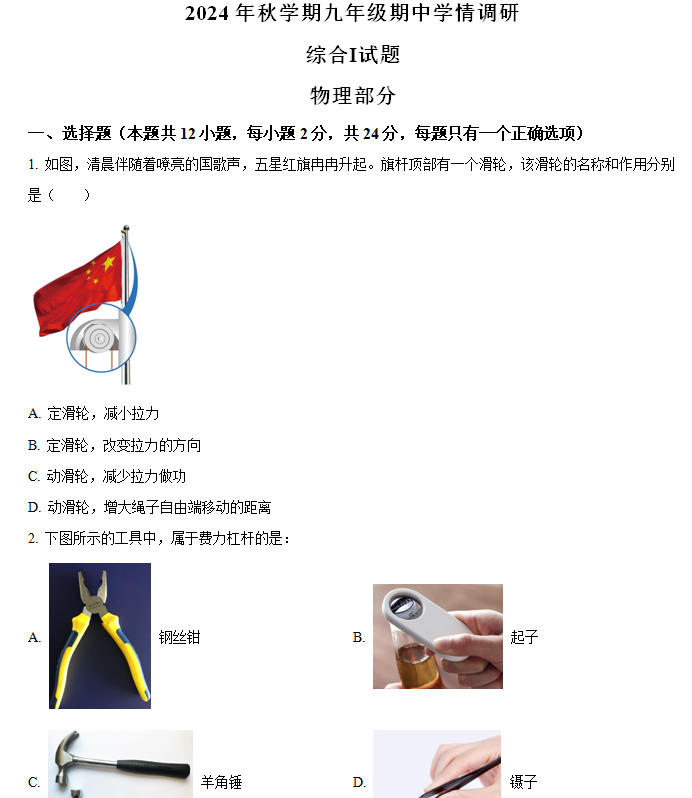 江苏100教学资源网 九上 江苏省盐城市阜宁县2024-2025学年九年级上学期11月期中物理试题(含解析) https://www.jiangsu100.com/14061.html