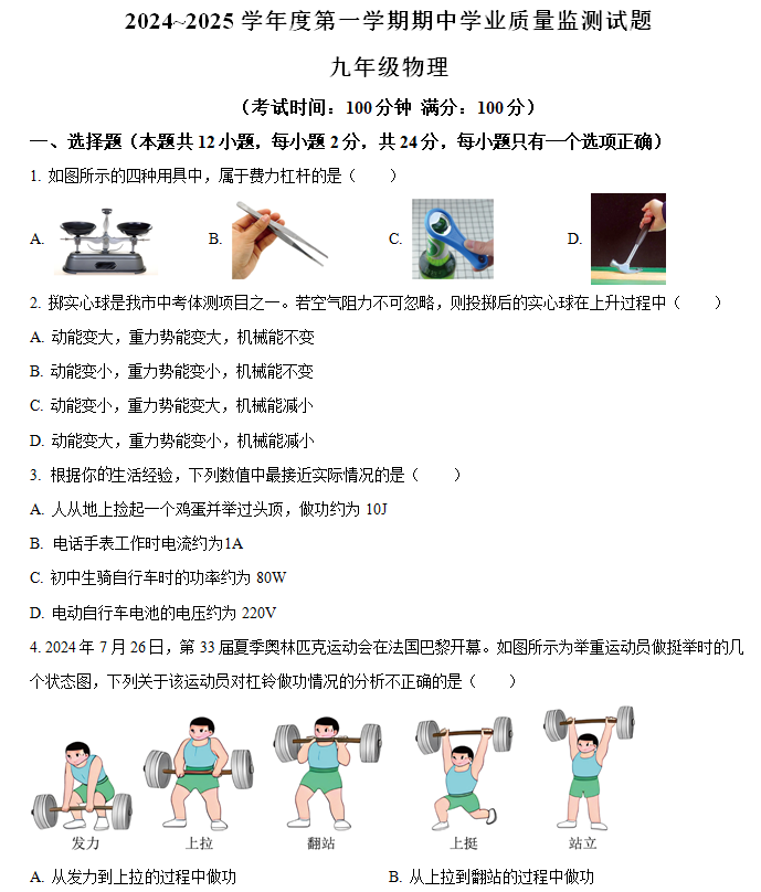 江苏100教学资源网 九上 江苏省扬州市高邮市2024-2025学年九年级上学期期中考试物理试题(含解析) https://www.jiangsu100.com/14074.html