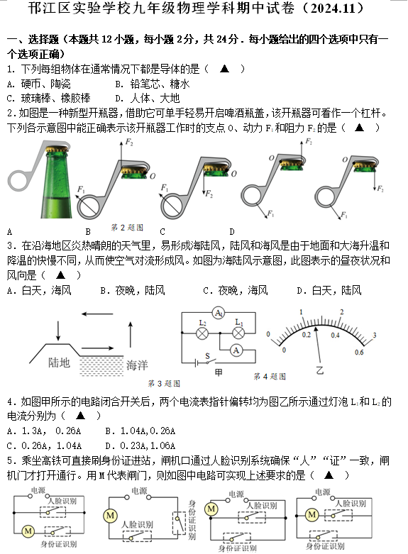 江苏100教学资源网 九上 江苏省扬州市邗江区实验学校2024-2025学年九年级上学期物理期中试卷(含答案) https://www.jiangsu100.com/14083.html