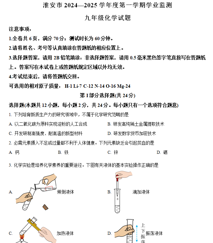江苏100教学资源网 九上 江苏省淮安市2024–2025学年九年级上学期期中考试化学试题(含解析) https://www.jiangsu100.com/14121.html