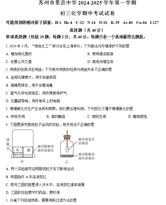江苏省苏州市景范中学2024-2025学年九年级上学期化学期中试卷(含解析)