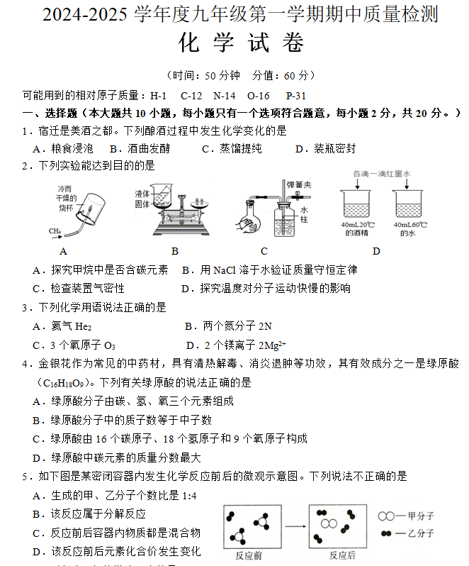 江苏100教学资源网 九上 江苏省宿迁市如东实验,崇文,洋河等校2024-2025学年九年级上学期期中联考化学试题(含答案) https://www.jiangsu100.com/14197.html