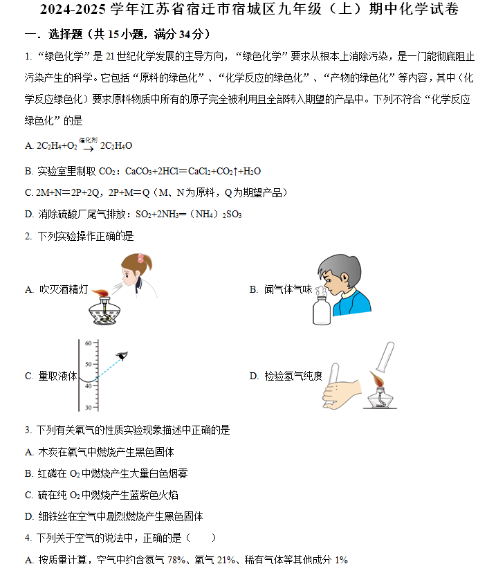 江苏100教学资源网 九上 江苏省宿迁市宿城区2024-2025学年九年级上学期期中化学试卷(含解析) https://www.jiangsu100.com/14204.html