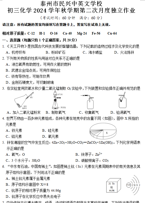 江苏100教学资源网 九上 江苏省泰州市民兴中英文学校2024~2025学年九年级上学期第二次月度检测化学试题(含答案) https://www.jiangsu100.com/14219.html