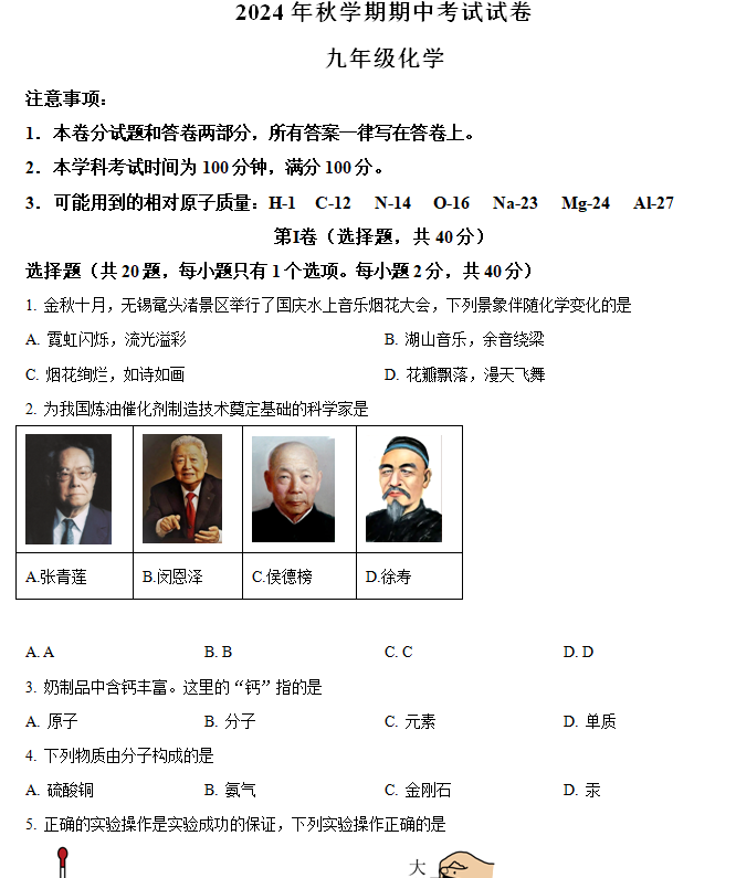 江苏100教学资源网 九上 江苏省无锡市滨湖区太湖格致中学2024-2025学年九年级上学期11月期中化学试题(含解析) https://www.jiangsu100.com/14225.html