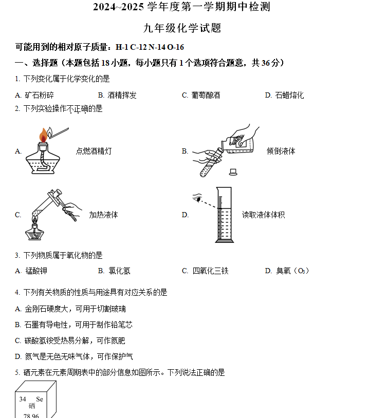 江苏省徐州市2024-2025学年九年级上学期期中检测化学试题(含解析)