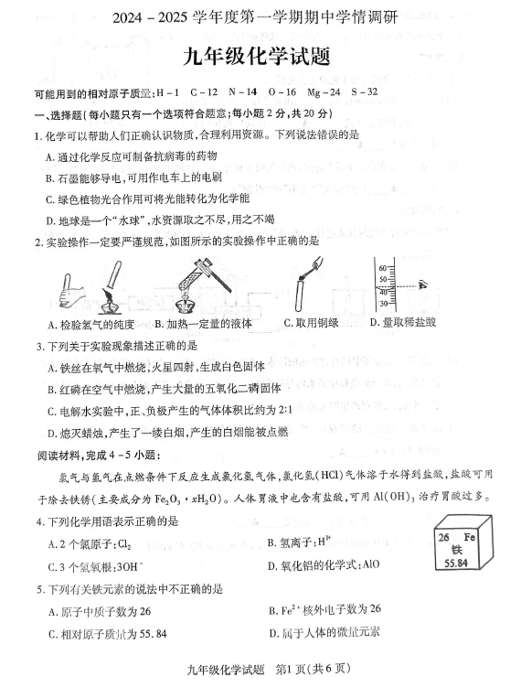 江苏100教学资源网 九上 江苏省徐州市丰县2024-2025学年九年级上学期期中考试化学试题(含答案) https://www.jiangsu100.com/14248.html