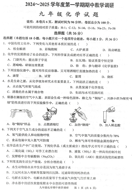 江苏100教学资源网 九上 江苏省徐州市邳州市2024-2025学年九年级上学期11月期中化学试题(含答案) https://www.jiangsu100.com/14251.html