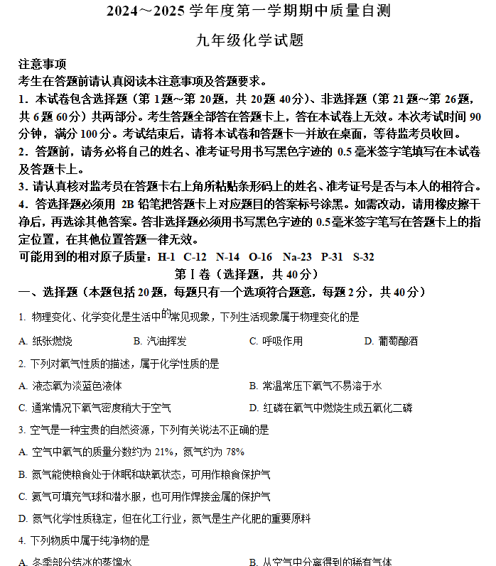 江苏100教学资源网 九上 江苏省徐州市铜山区2024-2025学年九年级上学期11月期中考试化学试题(含解析) https://www.jiangsu100.com/14254.html