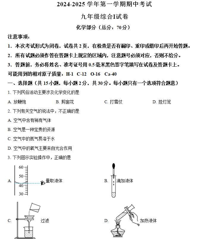 江苏100教学资源网 九上 江苏省盐城市东台实验中学教育集团2024-2025学年九年级上学期期中化学试题(含解析) https://www.jiangsu100.com/14266.html