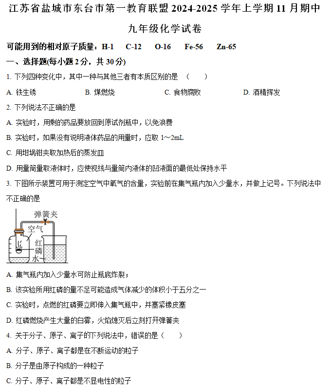 江苏100教学资源网 九上 江苏省盐城市东台市第一教育联盟2024-2025学年九年级上学期11月期中联考化学试题(含解析) https://www.jiangsu100.com/14277.html