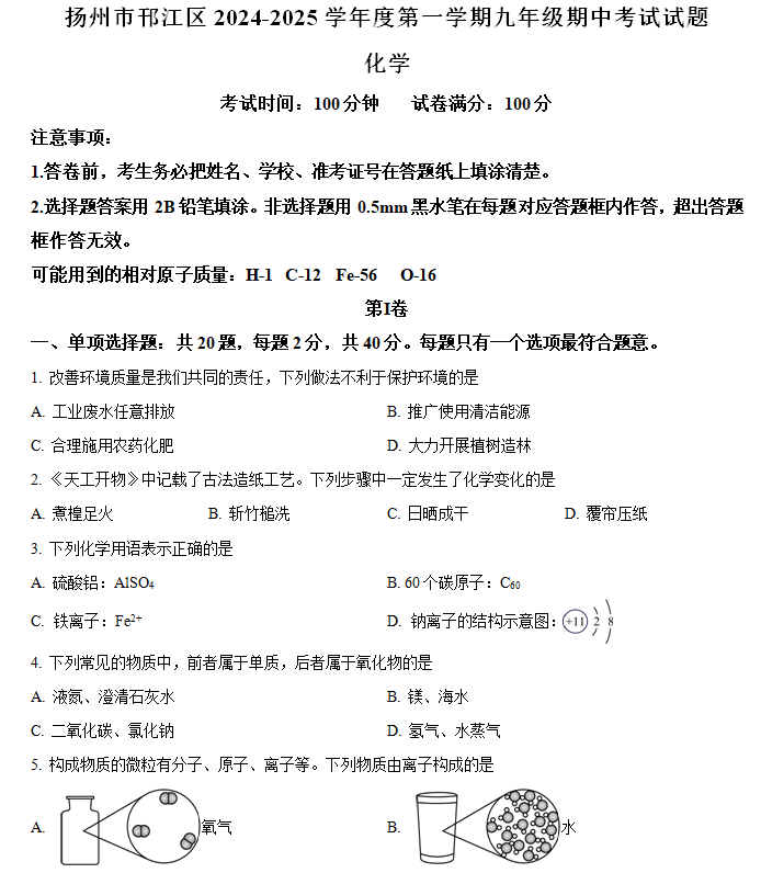 江苏100教学资源网 九上 江苏省扬州市邗江区2024-2025学年九年级上学期期中考试化学试卷(含解析) https://www.jiangsu100.com/14310.html