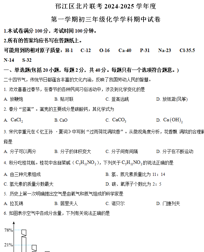 江苏100教学资源网 九上 江苏省扬州市邗江区北片区2024-2025学年九年级上学期期中联考化学试卷(含解析) https://www.jiangsu100.com/14313.html