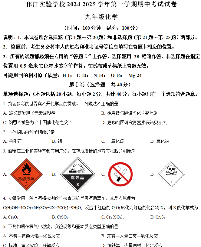 江苏100教学资源网 九上 江苏省扬州市邗江区实验学校2024–2025学年九年级上学期化学期中试卷(含解析) https://www.jiangsu100.com/14319.html