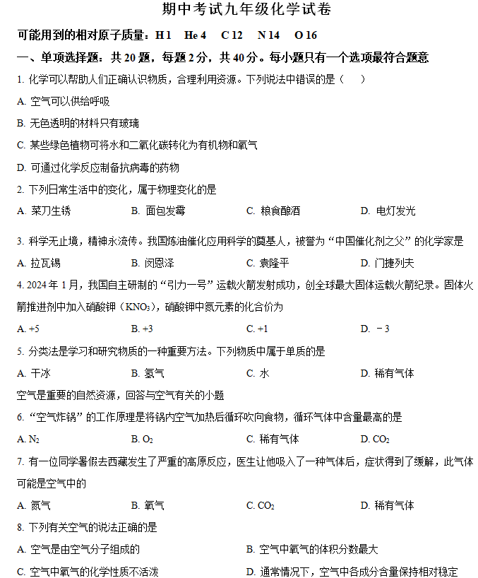 - 江苏省扬州市树人学校2024–2025学年九年级上学期期中化学试卷(含答案) 2025-09-21