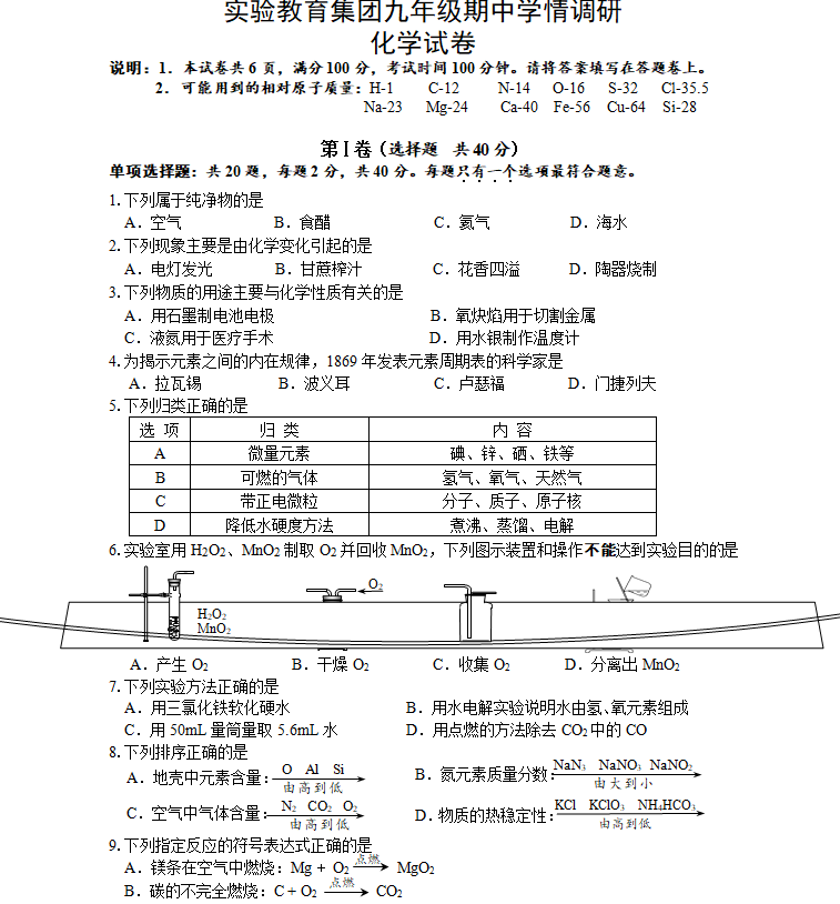 江苏100教学资源网 九上 江苏省镇江市丹阳市华南实验学校集团2024-2025学年九年级上学期期中化学试卷(含答案) https://www.jiangsu100.com/14340.html