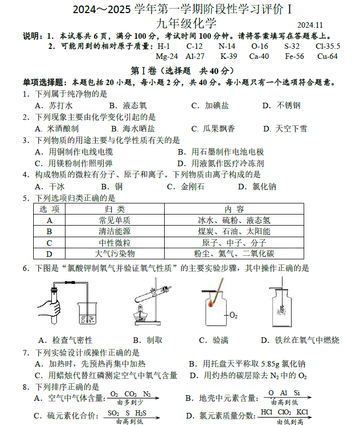 江苏100教学资源网 九上 江苏省镇江市京口区京口中学、镇江市第十中学2024-2025学年九年级上学期11月期中化学试题(含答案) https://www.jiangsu100.com/14343.html