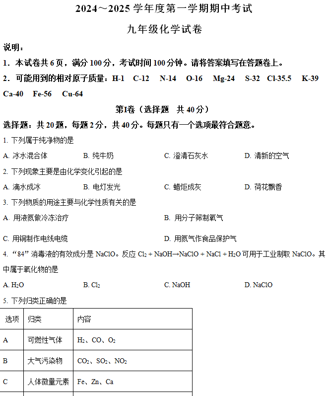 江苏100教学资源网 九上 江苏省镇江市市属学校2024-2025学年九年级上学期期中考试化学试卷(含解析) https://www.jiangsu100.com/14349.html