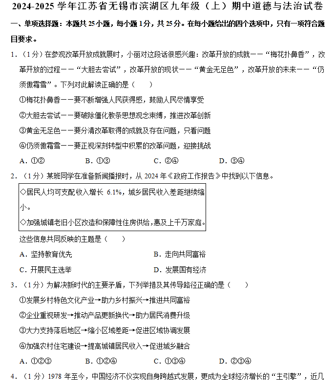 江苏100教学资源网 九上 江苏省无锡市滨湖区2024-2025学年九年级上学期11月期中质量监测道德与法治试卷(含解析) https://www.jiangsu100.com/14393.html