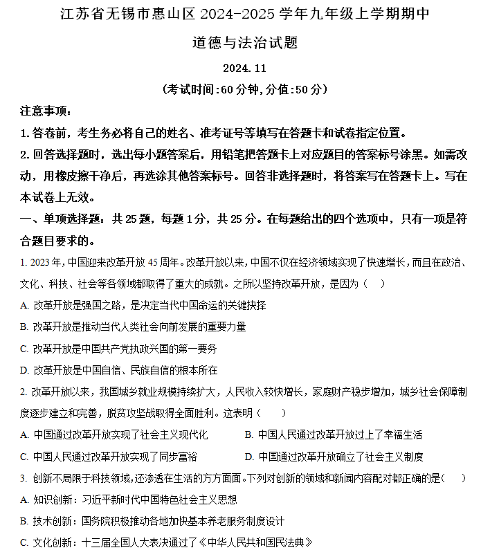 江苏100教学资源网 九上 江苏省无锡市惠山区2024-2025学年九年级上学期期中道德与法治试题(含解析) https://www.jiangsu100.com/14396.html