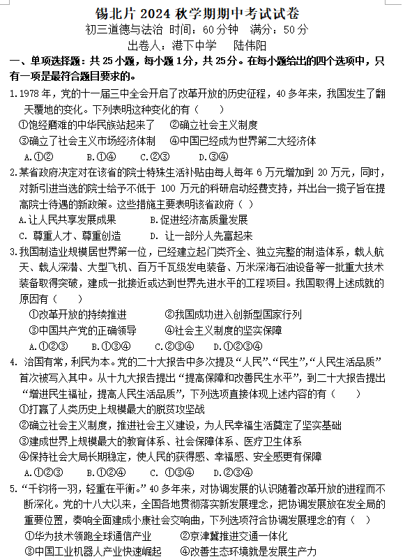 江苏100教学资源网 九上 江苏省无锡市锡北片2024-2025学年九年级上学期期中考试道德与法治试题(含答案) https://www.jiangsu100.com/14402.html