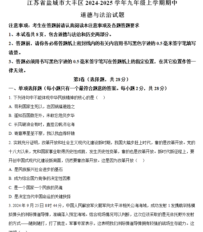 江苏100教学资源网 九上 江苏省盐城市大丰区2024-2025学年九年级上学期期中道德与法治试题(含解析) https://www.jiangsu100.com/14414.html