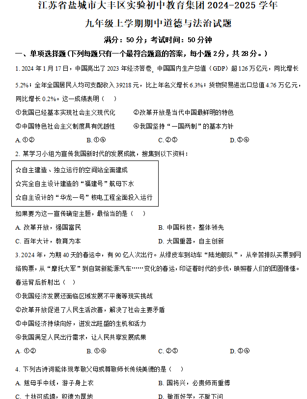江苏100教学资源网 九上 江苏省盐城市大丰区实验初中教育集团2024-2025学年九年级上学期期中模拟道德与法治试题(含解析) https://www.jiangsu100.com/14417.html