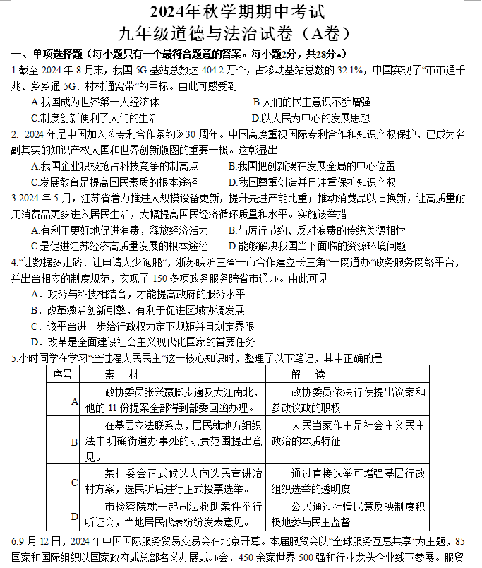 江苏100教学资源网 九上 江苏省盐城市射阳县实验初级中学2024-2025学年九年级上学期期中考试道德与法治试题(A卷)(含答案) https://www.jiangsu100.com/14432.html
