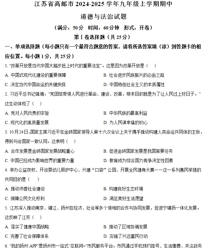 江苏100教学资源网 九上 江苏省扬州市高邮市2024-2025学年九年级上学期期中道德与法治试题(含解析) https://www.jiangsu100.com/14443.html