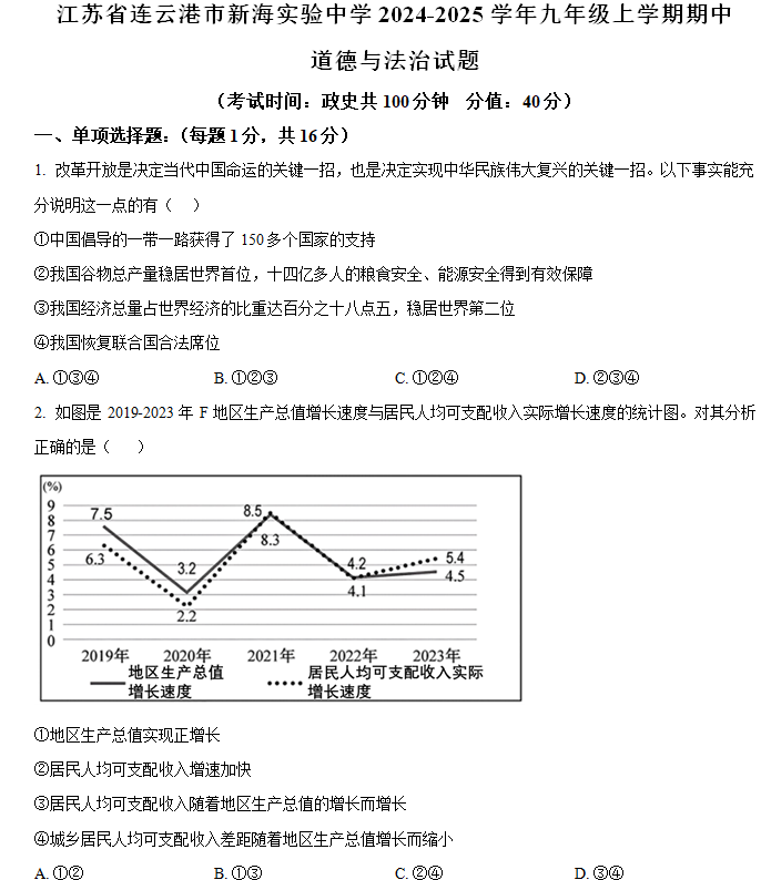 江苏100教学资源网 九上 江苏省连云港市新海实验中学2024-2025学年九年级上学期期中道德与法治试题(含答案) https://www.jiangsu100.com/14467.html