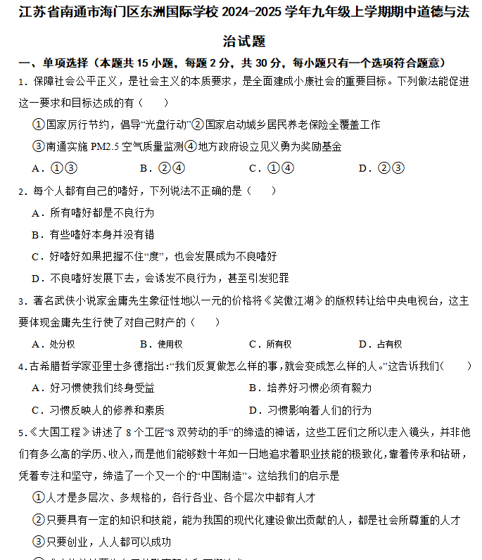 江苏100教学资源网 九上 江苏省南通市海门区东洲国际学校2024-2025学年九年级上学期期中道德与法治试题(含解析) https://www.jiangsu100.com/14473.html