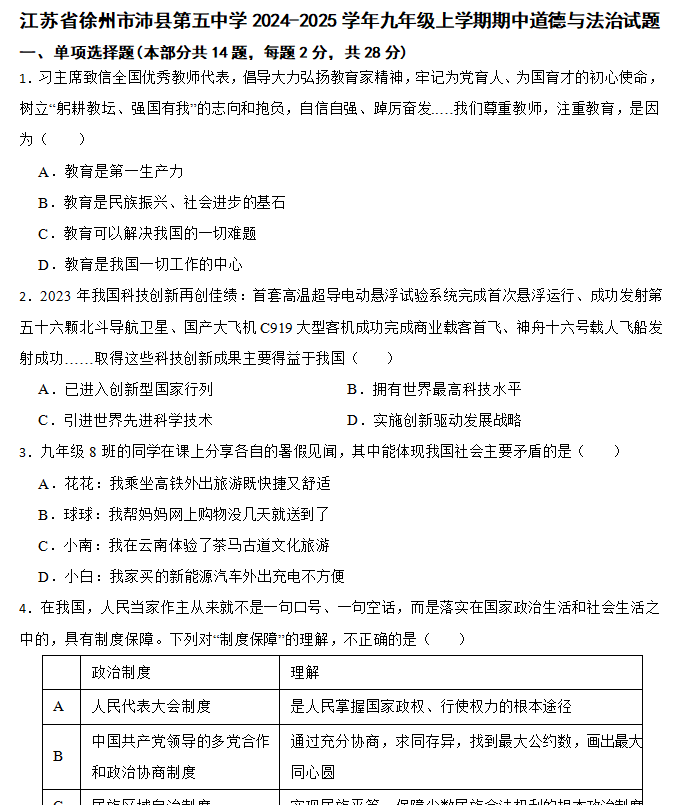 江苏100教学资源网 九上 江苏省徐州市沛县第五中学2024-2025学年九年级上学期期中道德与法治试题(含解析) https://www.jiangsu100.com/14489.html