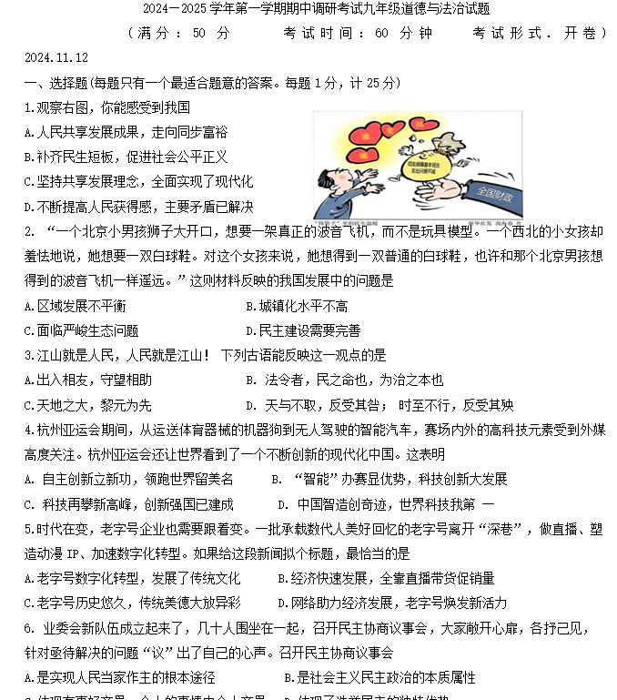 江苏100教学资源网 九上 江苏省扬州市广陵区2024-2025学年九年级上学期11月期中道德与法治试卷(含答案) https://www.jiangsu100.com/14508.html