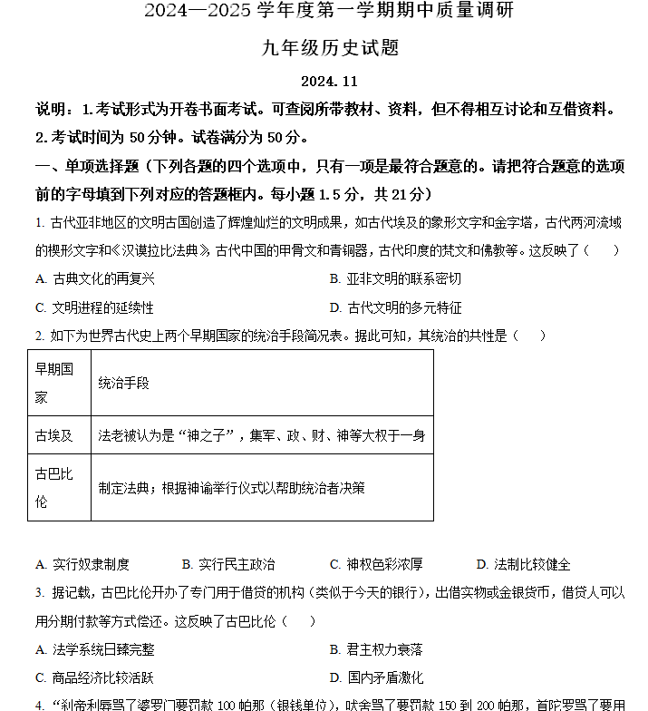 - 江苏省苏州市姑苏区2024-2025学年九年级上学期期中考试历史卷(含答案) 2025-09-21