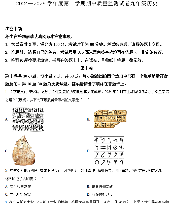 江苏100教学资源网 九上 江苏省南通市崇川区2024-2025学年九年级上学期期中历史试题(含解析) https://www.jiangsu100.com/14523.html