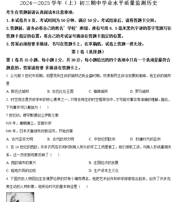 - 江苏省苏州市姑苏区2024-2025学年九年级上学期期中考试历史卷(含答案) 2025-09-21